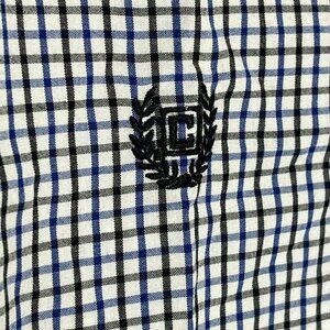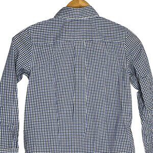 Classic Chaps boys’ button down shirt in navy blue and white plaid check pattern. Features a collared neckline, long sleeves, and easy-care fabric. Size 8 (small). Perfect for school, church, family photos, or everyday casual wear. Preowned and in good condition.