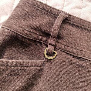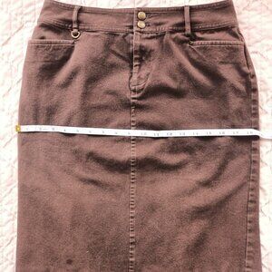 Timeless and flattering chocolate brown skirt by Chaps, made with 93% cotton and 7% elastane for a structured but comfortable fit. Features a shorter pencil silhouette with a subtle fishtail hem at the back, double button closure, and signature brass hardware including a logo D-ring. It hits me just above the knee and really hugs the curves (I'm 5'7" and 140 lbs) - please see pics for measurements. Nice sturdy cotton with slight stretch.