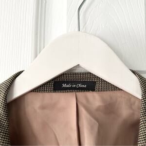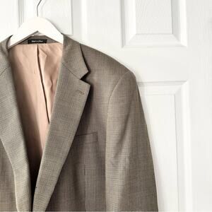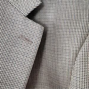 Size 48L from Chaps. Brown micro houndstooth plaid print wool blazer. Two button closure. Lined. Single vented back. Preowned in goods condition with no stains or tears.