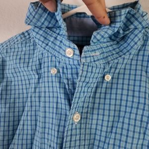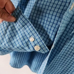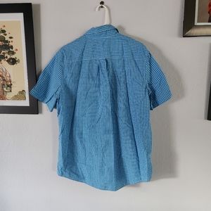 Short sleeves sky blue plaid button down top.