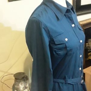 Long sleeve with option to roll & button sleeves to make 3/4 length, buttons completely down the front, removable belt, 2 slide pockets at waist, 2 button pockets on chest. Preloved in like new condition. No condition issues. 100% Cotton