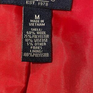 Chaps ButtonDown mid-length winter coat with antler-like hook and loop closure (black). Two front pockets with flaps. Neck closure with button for warmth and has a hood. Gently worn - good condition. Size M Warm red color. Comfy and warm. 60% Wool; 25% Poly; 10% Viscose; 5% other. Lining: Poly