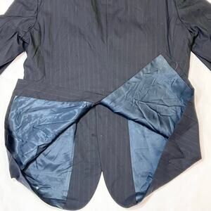 Introducing a Chaps by Ralph Lauren 2 Button Blazer in navy blue, crafted from virgin wool in size large. This jacket features two pockets and is pre-owned, originally sold at Nordstrom. Please note there are some minor stains on the inside of the jacket and a small hole on the back side, as shown in pictures. There is no for size but considering the measurements it measures as a large.