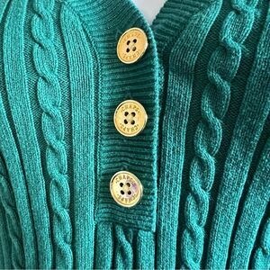 Listing is for a green size S Chap’s cables v-neck sweater with three gold buttons.