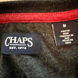 A stylish Chaps Charcoal Gray Long Sleeve Jersey Henley Shirt for men in medium size. Featuring a short button placket and logo detail on the chest. Made from 60% cotton and 40% polyester for comfort and durability.