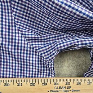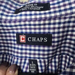 Chaps shirt, blue checkered, classic fit, men's button-up, long sleeve shirt, wrinkle-free shirt, casual wear, formal wear, size L, stylish shirt, durable shirt, chest pocket, cotton polyester blend