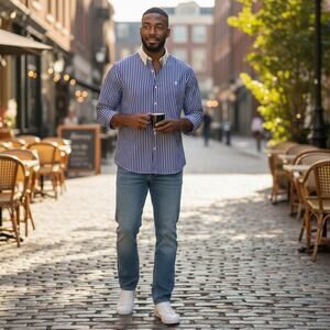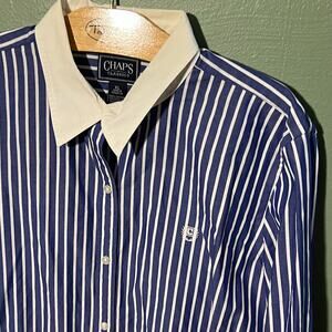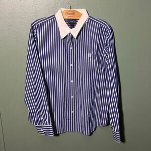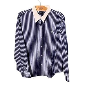 This stylish Chaps Classics striped shirt in XL features a bold blue and white design, made from 100% cotton for a comfortable fit. Crafted in Indonesia, it’s perfect for casual wear or a smart-casual look with its classic button-front and white collar. Add this versatile piece to your wardrobe today—great for any season!