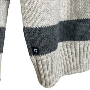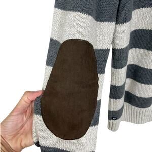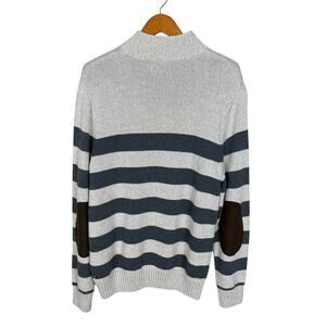 100% cotton striped pullover sweater. Mock neck with 1/4 button front. Long sleeves with ribbed cuffs, Faux suede elbow patches. Beige with blue gray stripes. Size large. Please see photos for measurements.