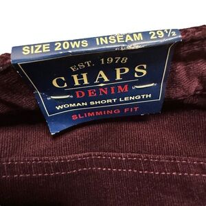 Chaps Denim Plum Women's Slimming Fit Short Length Corduroy Pants Size 20W NWT Chaps Denim by Ralph Lauren Soft! Approximate measurements when laying flat: Waist: 21 inches Rise: 12 inches Length: 29.5 inches Ankle: 9 inches NWT!