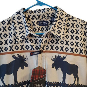 Brand new with tags Chaps men’s long sleeve shirt in a bold and rustic moose and geometric print. The perfect gift for the outdoorsy guy, lodgecore fan, or cabin dweller. Tag attached.