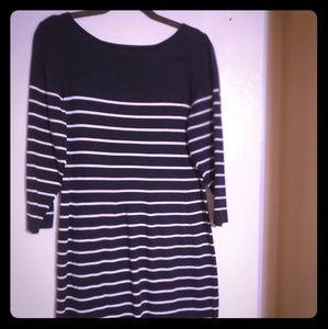 Navy blue and white striped sheath dress