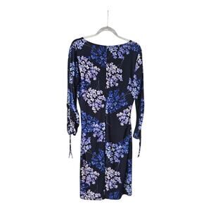 Chaps Dress L Crossover V-Neck 3/4 Sleeve Ruching Blue Purple Floral Stretch