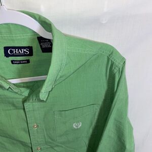 This mens green Chaps dress shirt is in great shape! This item comes in a size Small Armpit to armpit is 21 Armpit to sleeve is 19 Back of collar to hem is 32 Thanks for looking at our item!