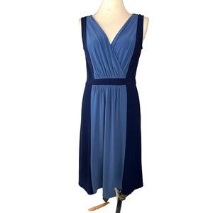 This beautiful Chaps dress in size medium features a stunning Grecian draped bodice with pleated accents and a flattering fit and flare style. The dress is made of a blue on blue colorblock polyester knit fabric with a midi length hemline and strappy sleeve. It has a V-neckline and a zip closure at the back. Perfect for a variety of occasions, this dress is machine washable and wrinkle-resistant, making it easy to care for. The dress also features slimming and stretch properties, as well as a collarless design. No flaws.