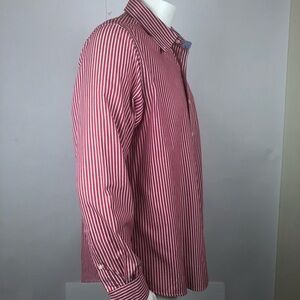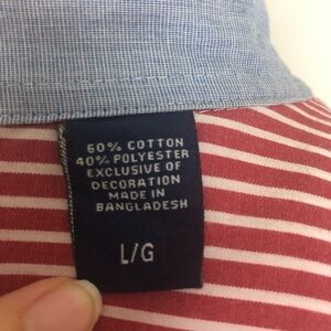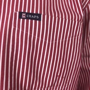 Chaps men’s shirt, red striped button down, business casual shirt, classic fit shirt, easy care shirt, wrinkle-free shirt, men’s large dress shirt, Chaps size L shirt