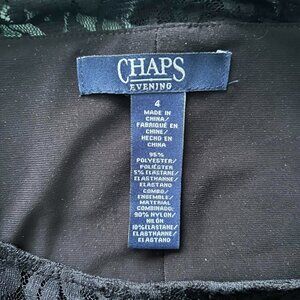 Chaps formal black dress. Lace boatneck with long sleeves. The body is ultra stretchy. I’m a size 12 and I can still get into this lol. Obviously I’d recommend someone smaller get this dress. The lace is not stretchy. Due to that, I’d suggest a 4-8 can comfortably wear this. A rouched gathering at the waist is flattering to hide any stomach bloat. This holds you in and shapes you so well. I’m wearing no bra or shape wear in these pics. Double lined