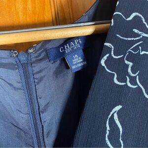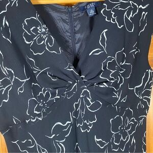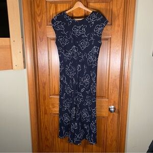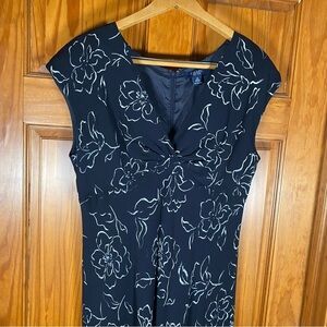 Beautiful midi dress by Chaps! Fully lined, has padding in the shoulders to make a puffed effect, and features a knot design in the front. Really dark navy almost black color with white floral patter.