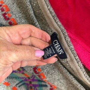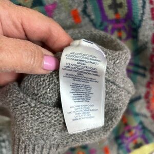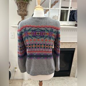 Chaps sweater in gray with vibrant multicolor design. Crew neck style. Perfect for a stylish look. Great layering sweater. Fabulous style. Size Large Petite. Excellent used condition Pit to pit 19”