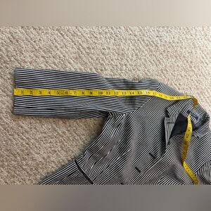 This Chaps blazer features a classic black and white pinstripe pattern, offering a tailored silhouette with a notched collar and 3/4 length sleeves. Crafted from a structured fabric, it is perfect for business or smart casual occasions, providing a polished and professional look. Blazer in good condition.