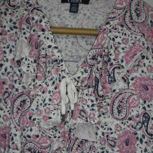 Chaps Ladies Cream/Blue/Pink Pasley V Neck with Ruffle Blouse 100 % Cotton Size Large No Smoke/No Pet Home