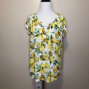 Chaps Lemon Print Yellow & Green Lace Up Front V Neck Top (S)