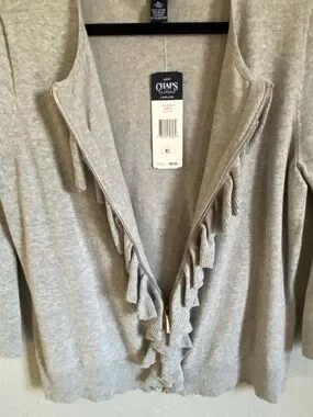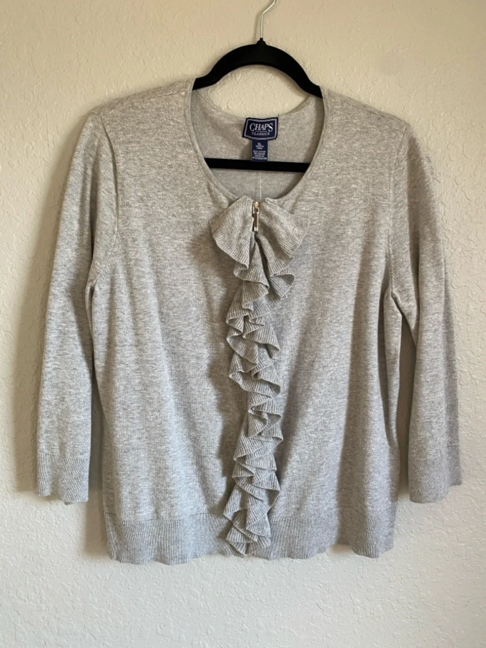 Soft knit Chaps sweater with vertical ruffle trim down the front. Zips all the way open between ruffle. Three-quarter sleeves. Lightweight, easy-to-layer style for everyday wear.