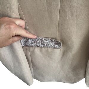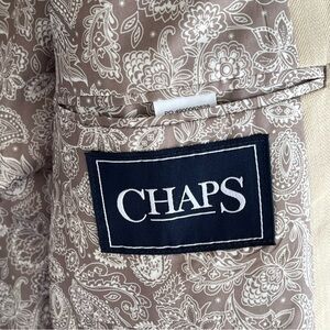 This Chaps sport coat offers a refined look with its classic notched lapel and structured shoulders. Crafted for versatility, this blazer is perfect for both business, smart casual settings, as well as Summer or beach weddings. Its light cream color makes it an ideal choice for spring and summer wear, ensuring you stay stylish and comfortable. And the neutral color is so versatile. Pair it with navy, khaki, green, pink, or white pants. The color list can go on. It is in excellent, never worn condition. There is a small light color piece of fabric sewn into the weave of the fabric from the manufacturer and could be removed. See last photo. Photos show a shadow at the bottom of the jacket. The color is not darker at the bottom. It is consistent throughout. It is in excellent used condition.