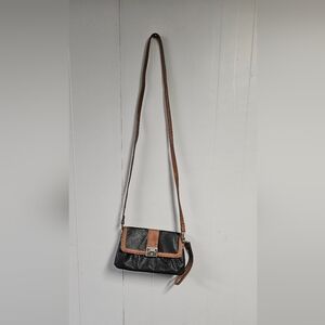 Chaps bonded leather crossbody or handbag purse, camel and black, inside and outside zippered pockets. Magnetic front closure. 48" Crossbody strap is removable to make a wristlet. 9-1/2" wide x 6" high. Fabric inside lining. Very good condition, looks to be unused. Reasonable offers considered. Thanks for looking!