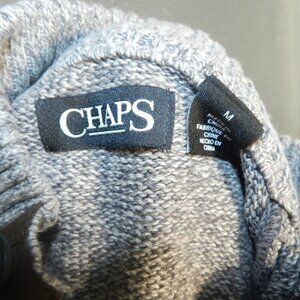This is a Mens Chaps Dark Green Grey And White Stripped Pull Over Mid Button Long Sleeve Winter Sweater In A Size Medium. The Sweater is used with tiny sign of wear but are hardly noticeable and almost looks new.