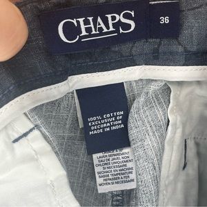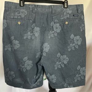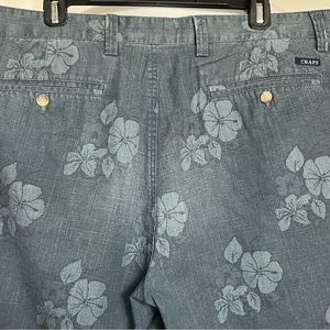 Chap’s Men’s Hawaiian Floral Print Flat Front shorts. Blue with lighter blue florals. Size 36. 100% cotton. Two side pockets and two buttoned back slit pockets. Zipper and button closure. In excellent used condition.