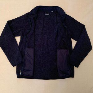 Dark blue fleece jacket with full-length zipper. Two pockets (no zipper). Fleece is very soft and comfortable.