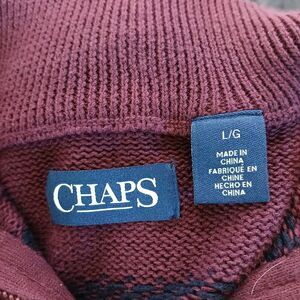 This is a pre-owned grandpacore style men's pullover sweater from Chaps in good condition..Great for school, work or everyday wear. The sweater is a burgundy color with horizontal stripes in a dark blue, textured knit pattern. It features a 1/4 zip collar and is in excellent condition with no visible flaws. It's a comfortable and stylish piece perfect for cooler weather.