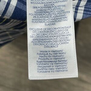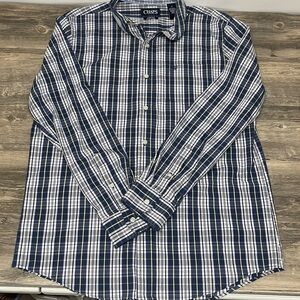 Classic and versatile Chaps Men’s Long Sleeve Button Down Shirt in a timeless blue, white, and yellow plaid pattern. Size Medium with stretch fabric for all-day comfort and easy-care wrinkle-resistant material.
