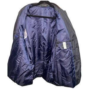 Chap’s Men's Navy Quilted Blazer Jacket with Brown Corduroy Trim, size 46R. Stay warm and stylish with this charcoal quilted jacket. Perfect for any occasion. 2 side pokets and 2 inside pockets. Jacket has open side style.