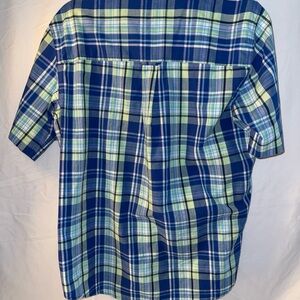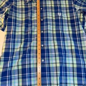 Casual button-down with a vibrant plaid pattern. Perfect for everyday wear. Classic Chaps style.