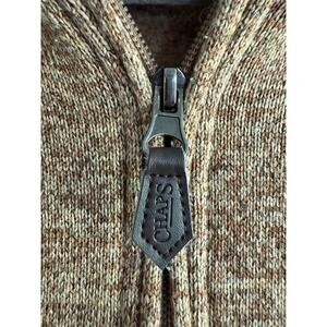 Chaps Men’s Quarter-Zip Pullover Sweater, size Large. Crafted from 100% polyester, this soft knit offers warmth without bulk—perfect for layering or wearing solo. The heathered tan color gives a classic, versatile look, while the stand collar and zip neckline add casual sophistication. Features the signature Chaps crest logo on the chest and durable ribbed trim for a refined finish. Ideal for work, weekends, or cool-weather outings.