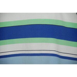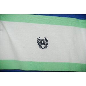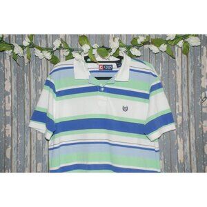 This Chaps Men's Short Sleeve Polo Shirt Size L in white, blue, and green stripes is perfect for a preppy, casual golf look. Made of cotton for comfort and durability.