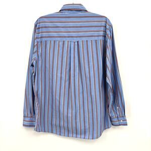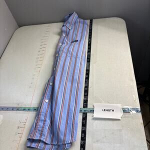 This classic Chaps button-down shirt features a timeless blue and orange striped pattern. Perfect for a casual yet polished look.