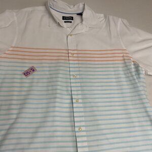 This Chaps shirt combines modern design with comfort. Featuring orange and blue stripes on white fabric, it offers a polished yet casual look.