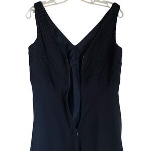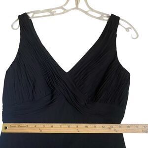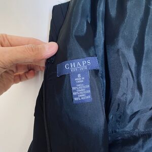 Brand; Chaps. Elegant, feminime, midi A-line dress, V-neck, sleeveless, draped detail, lined. Size: 8. Color; black. Fabric; polyester. Great pre-owned condition.