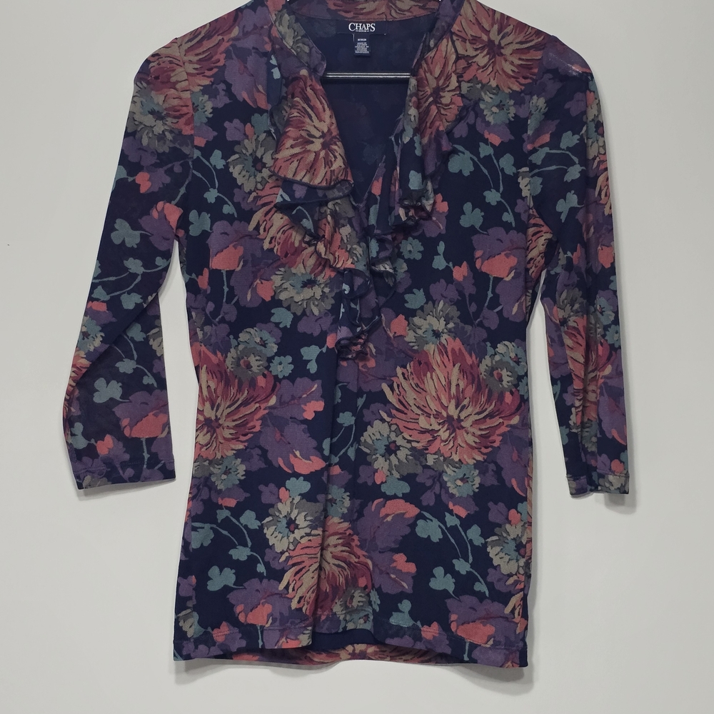 Vibrant floral blouse with ruffle detail. Three-quarter sleeves. Ideal for any occasion.