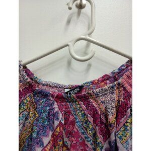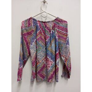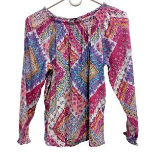 Vibrant blouse with a mix of pink, blue, and yellow patterns. Long sleeves. Relaxed fit.