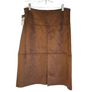 Chaps NWT Caramel Brown Faux Suede Boho Cowgirl Knee Length Skirt. Features faux suede construction, hook and eye closure, straight fit, unlined, and hidden side zipper.