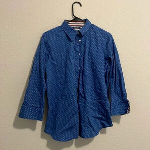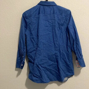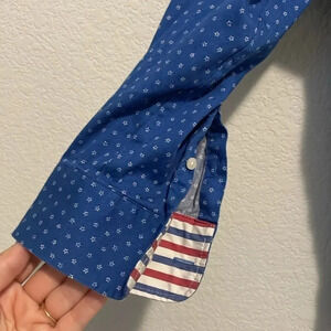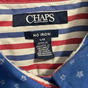Preowned nice condition size large Chaps no iron shirt. Blue with white stars and red, white and blue lining on collar and sleeves. 100% cotton.