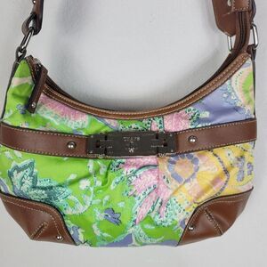 Pretty shoulder bag in a paisley print of spring colors with 2 open inside pockets, 1 zipper inside pocket and 1 zipper outside pocket!