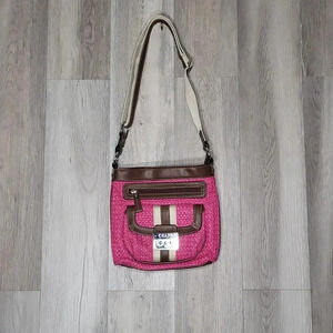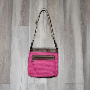Chaps Pink Brown Woven Faux Leather Multi Pocket Crossbody Bag