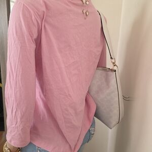 Elegant pink blouse with ruffled neckline. Perfect for casual outings.