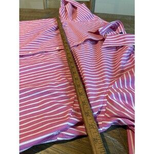 The product is a Chaps pink striped button-up shirt in a plus size 3X with a collared neckline and 3/4 sleeves. It is designed for women and suitable for casual occasions. The shirt features a classic and stylish design that is both comfortable and easy to wear. Perfect for pairing with jeans or a skirt, this top offers a flattering fit for those looking for a relaxed yet fashionable option in their wardrobe.