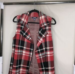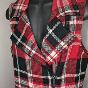 This Chaps vest features a striking plaid pattern in red and black, perfect for adding a bold touch to your outfit. It has a wide collar that can be styled open or closed, making it versatile for various looks. Great for layering.