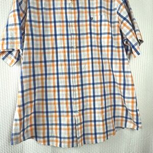 Keywords: Chaps, XXL, Extra Extra Large, Mens, Shirt, Button Down, Short Sleeve, Plaid, Orange, Blue, Cotton Blend, Casual, Easy Care, Relaxed Fit, Summer